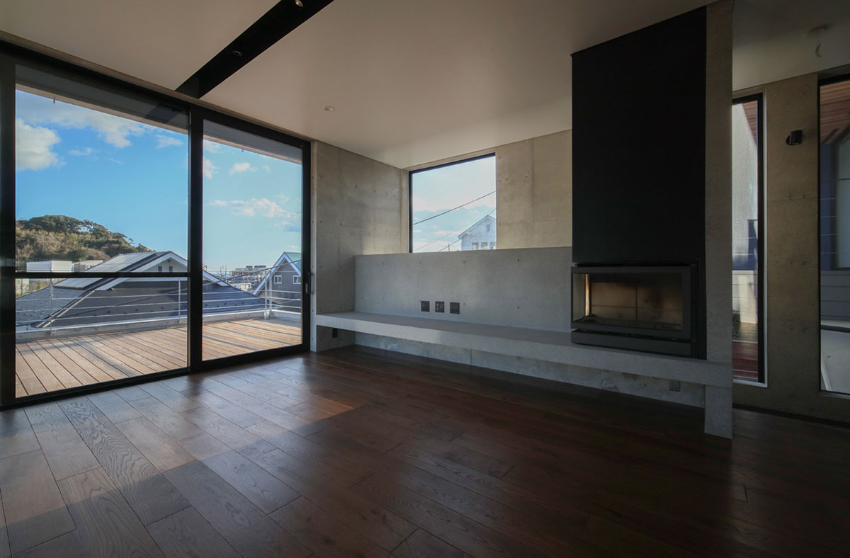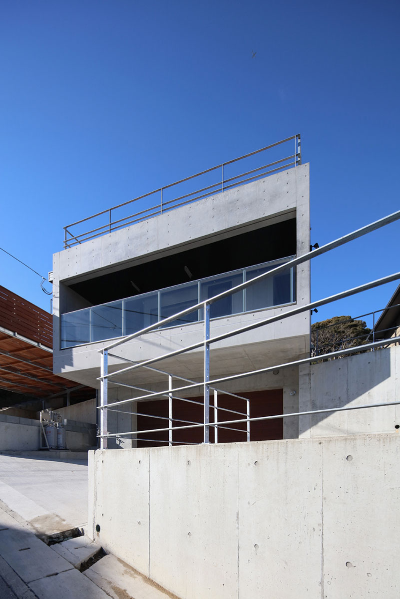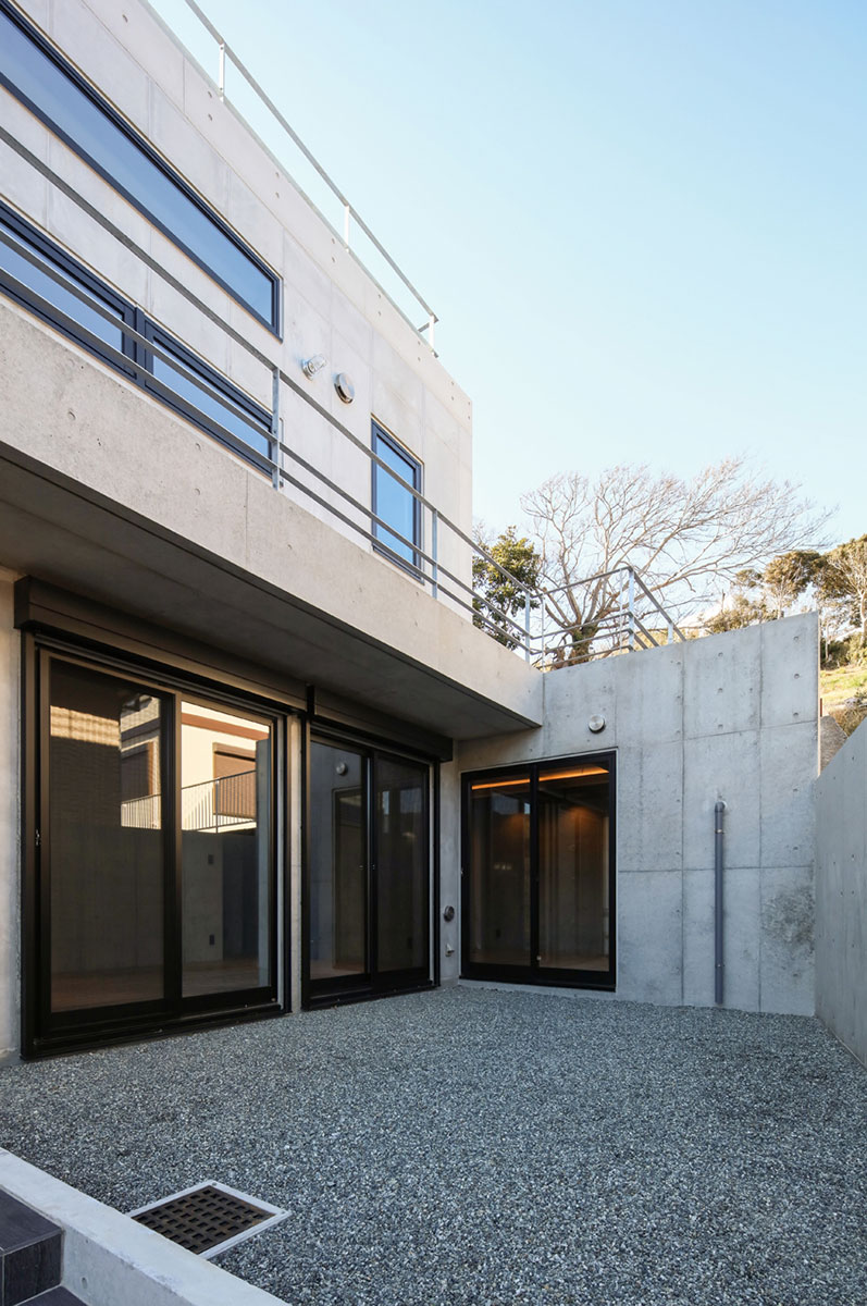 葉山の海沿いの道からほど近い傾斜地に建つRC外断熱住宅。