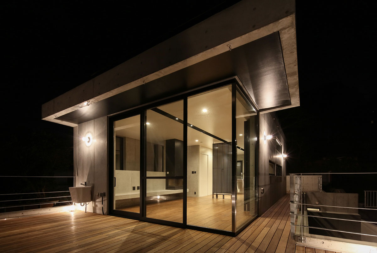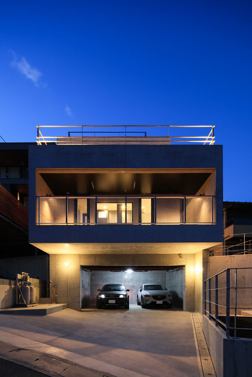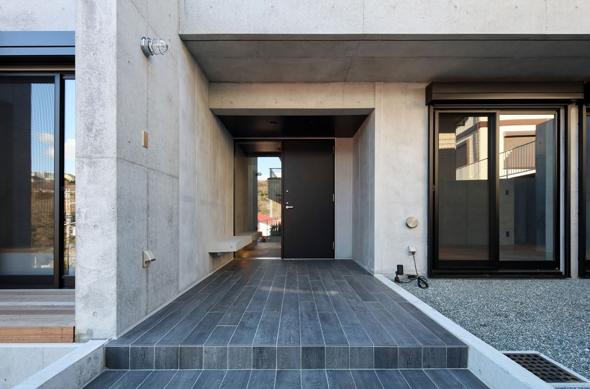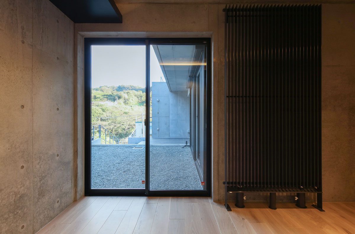葉山の海沿いの道からほど近い傾斜地に建つRC外断熱住宅。