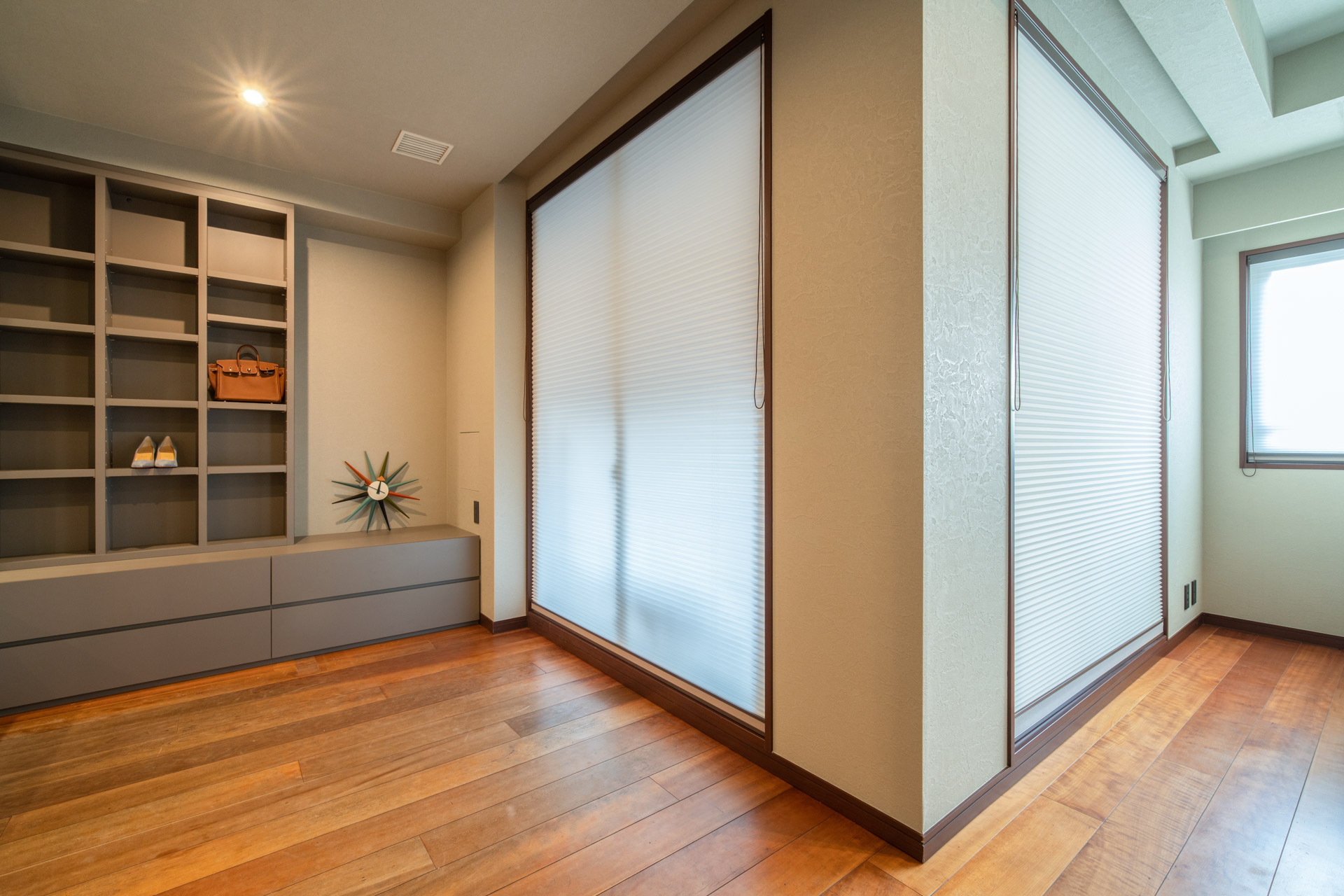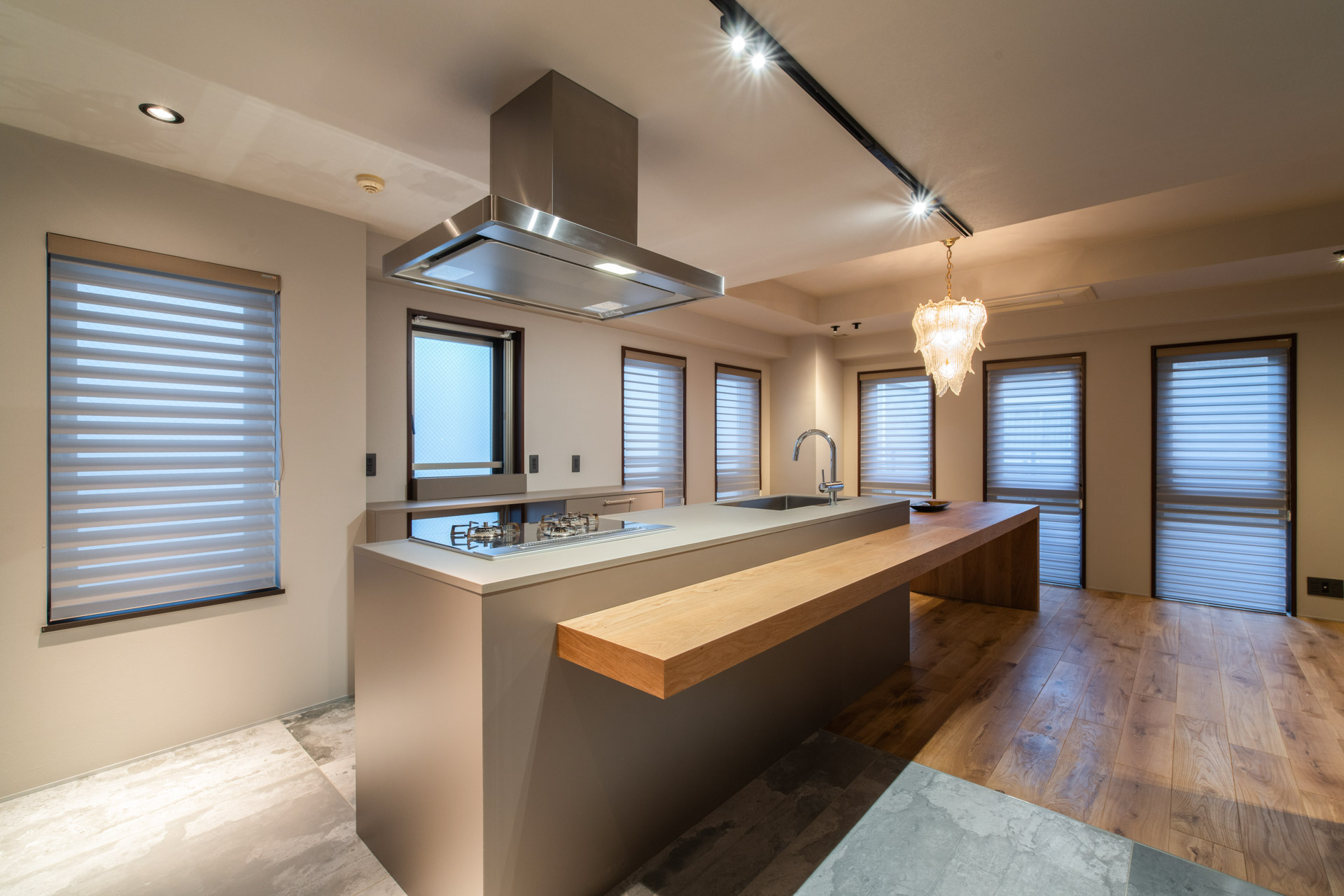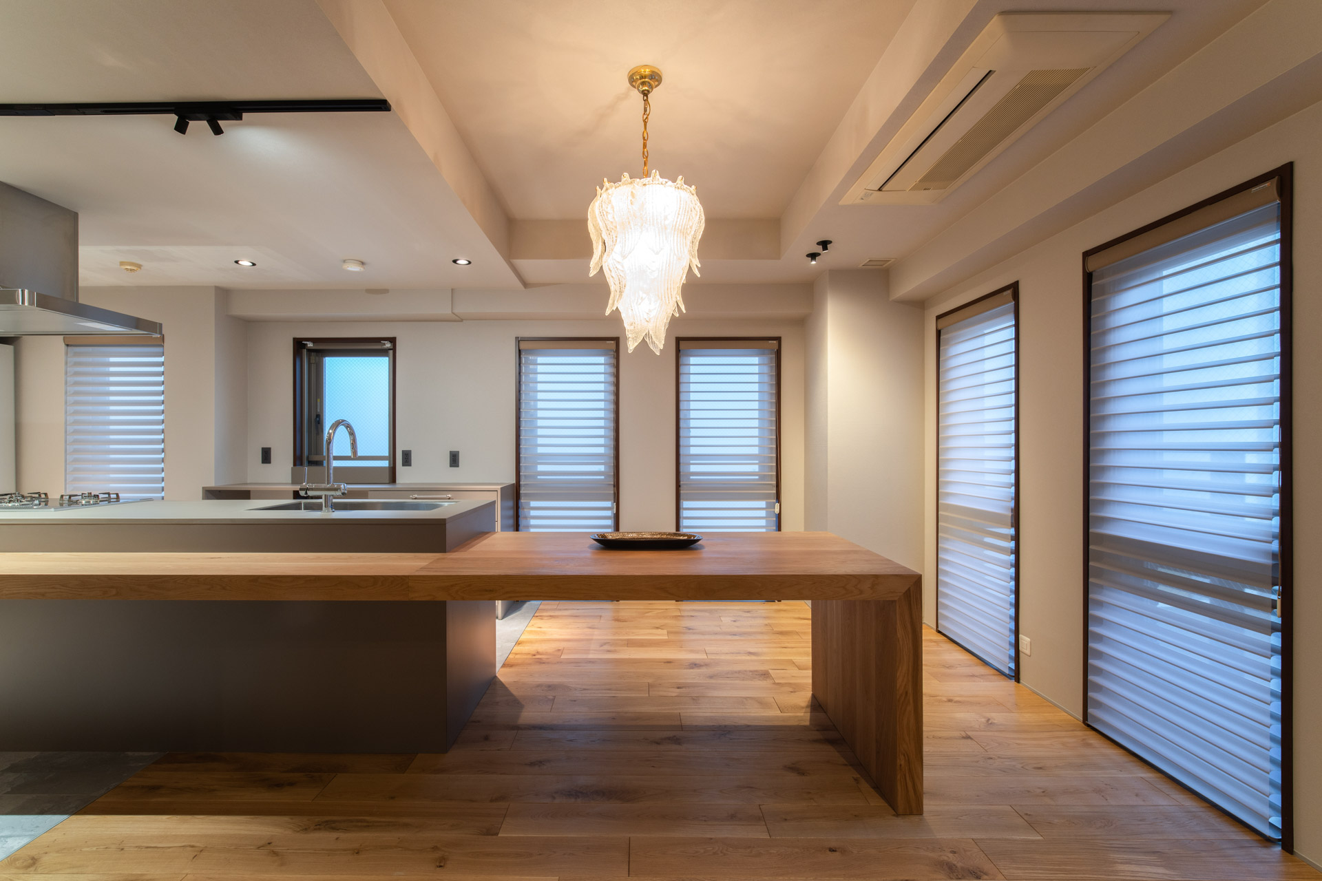 マンションの住戸の間取りは、建売住宅同様に、居住者の生活スタイルを表現するものとは言えず、居住者がその間取りに生活スタイルを合わせることとなります。永く住めば住むほど、ここがそうなら、あそこがこうなら…との思いが募ります。こちらのオーナー夫妻も、ご自身の生活スタイルとの違和感を今回一新しました。間取りとしては、東西を反転させ、明るい朝陽の差し込むダイニング、来客時にメインスペースとなるキッチン、寝室と連動した水回りを実現。既存の内装も上手に取り込みながら、違和感なく新しい住まいとなりました。