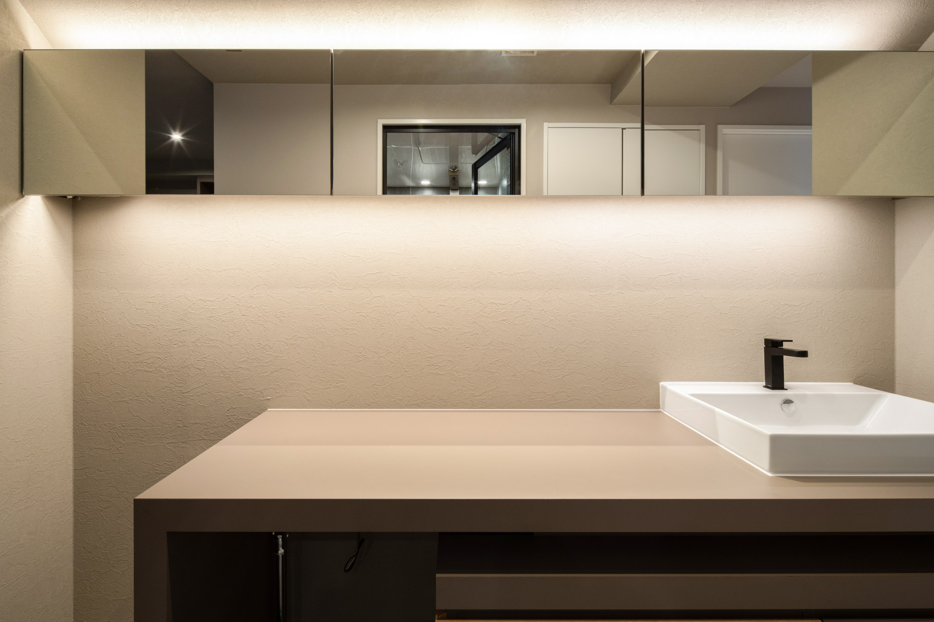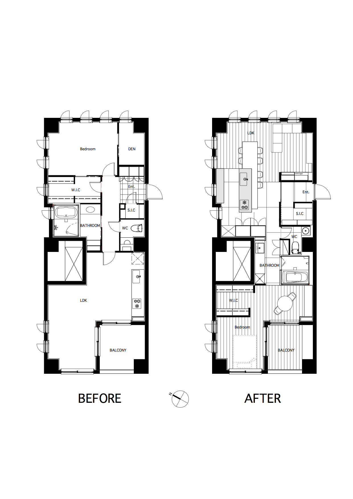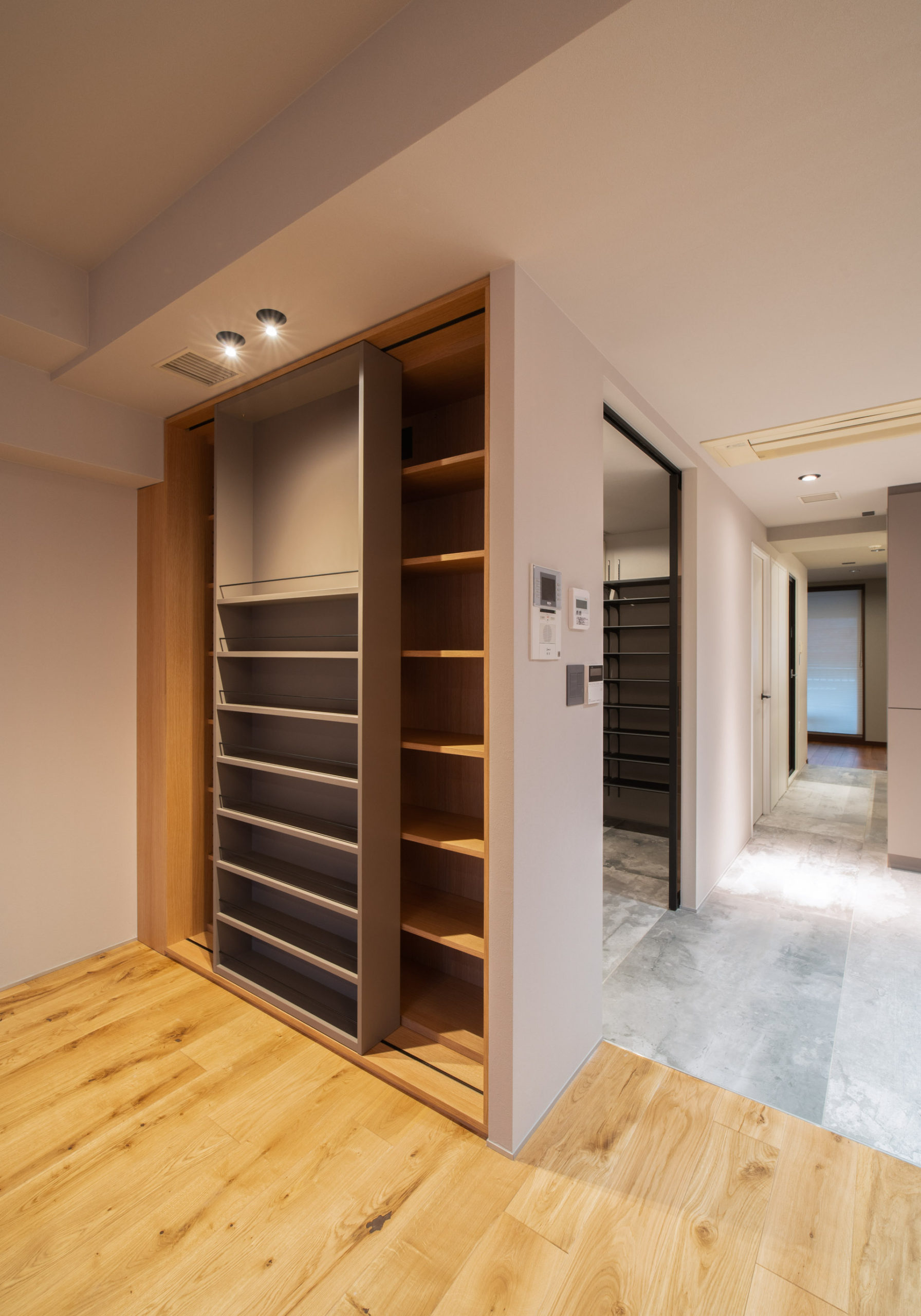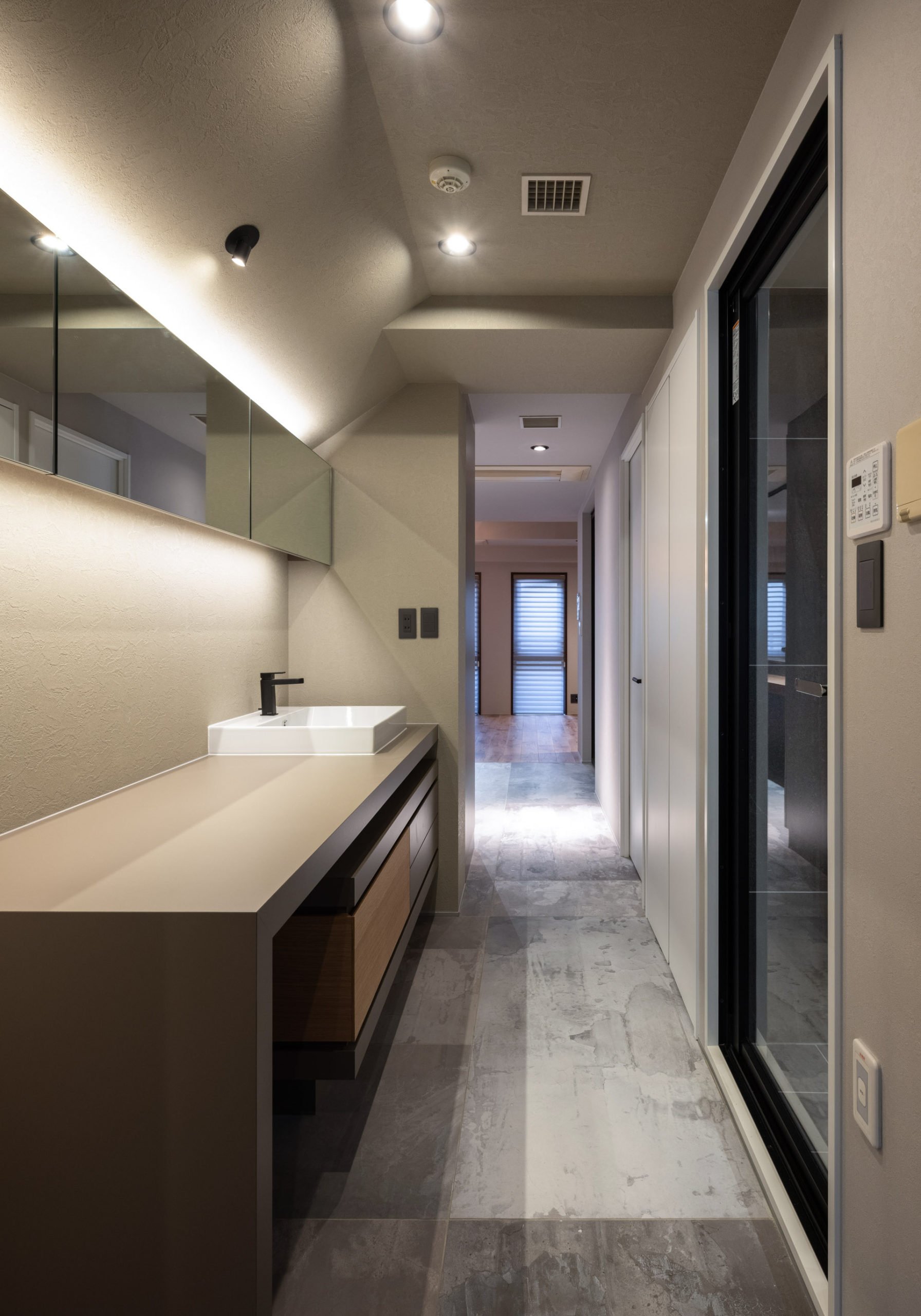 マンションの住戸の間取りは、建売住宅同様に、居住者の生活スタイルを表現するものとは言えず、居住者がその間取りに生活スタイルを合わせることとなります。永く住めば住むほど、ここがそうなら、あそこがこうなら…との思いが募ります。こちらのオーナー夫妻も、ご自身の生活スタイルとの違和感を今回一新しました。間取りとしては、東西を反転させ、明るい朝陽の差し込むダイニング、来客時にメインスペースとなるキッチン、寝室と連動した水回りを実現。既存の内装も上手に取り込みながら、違和感なく新しい住まいとなりました。