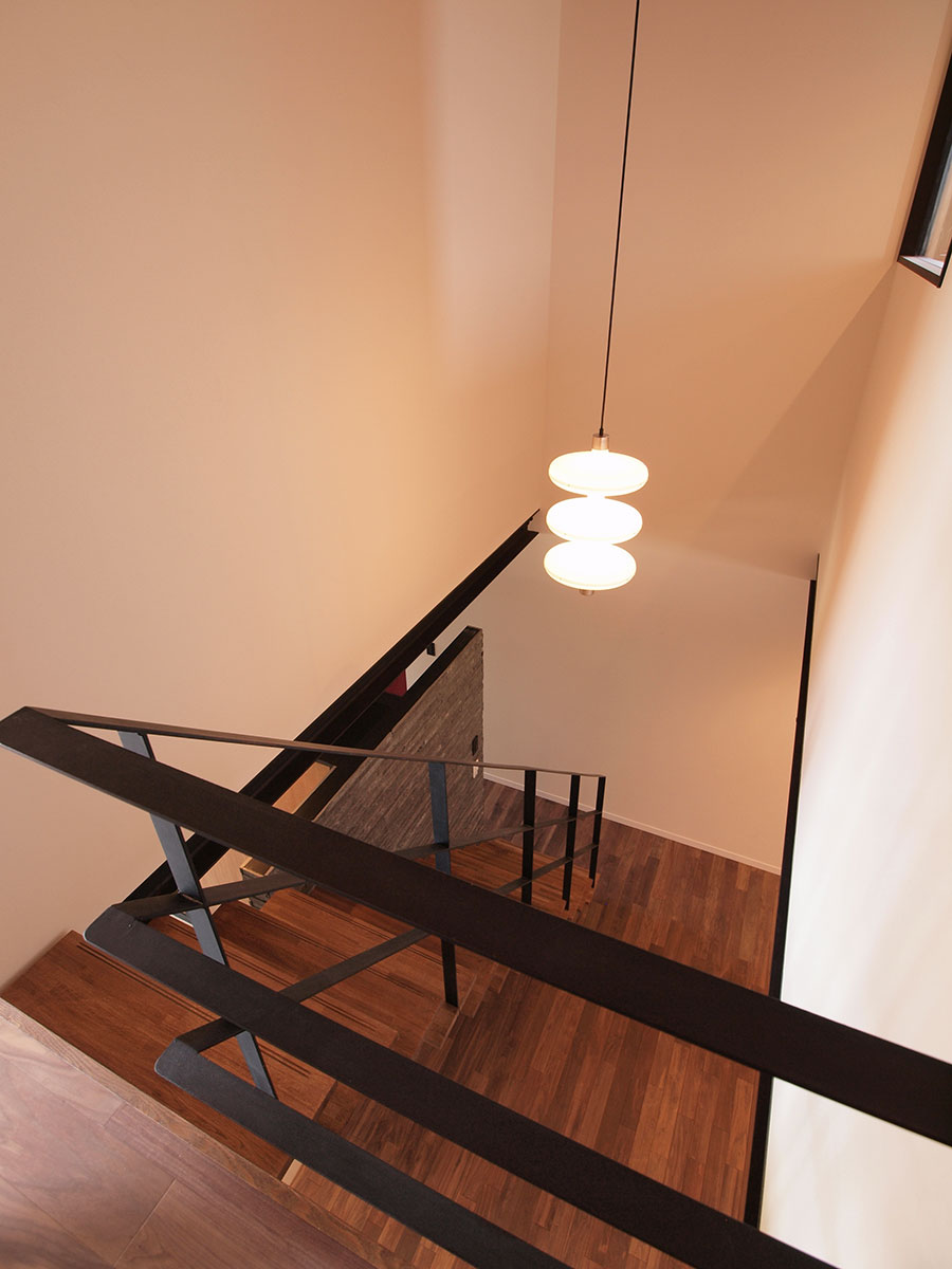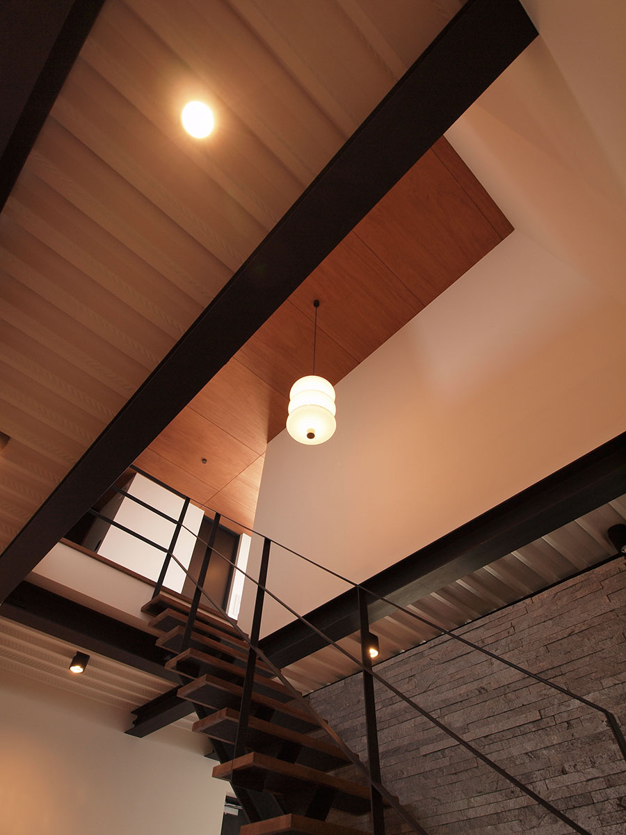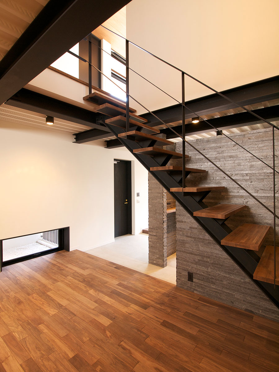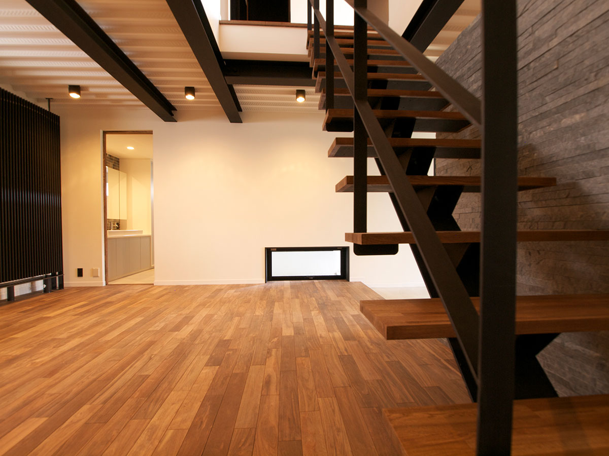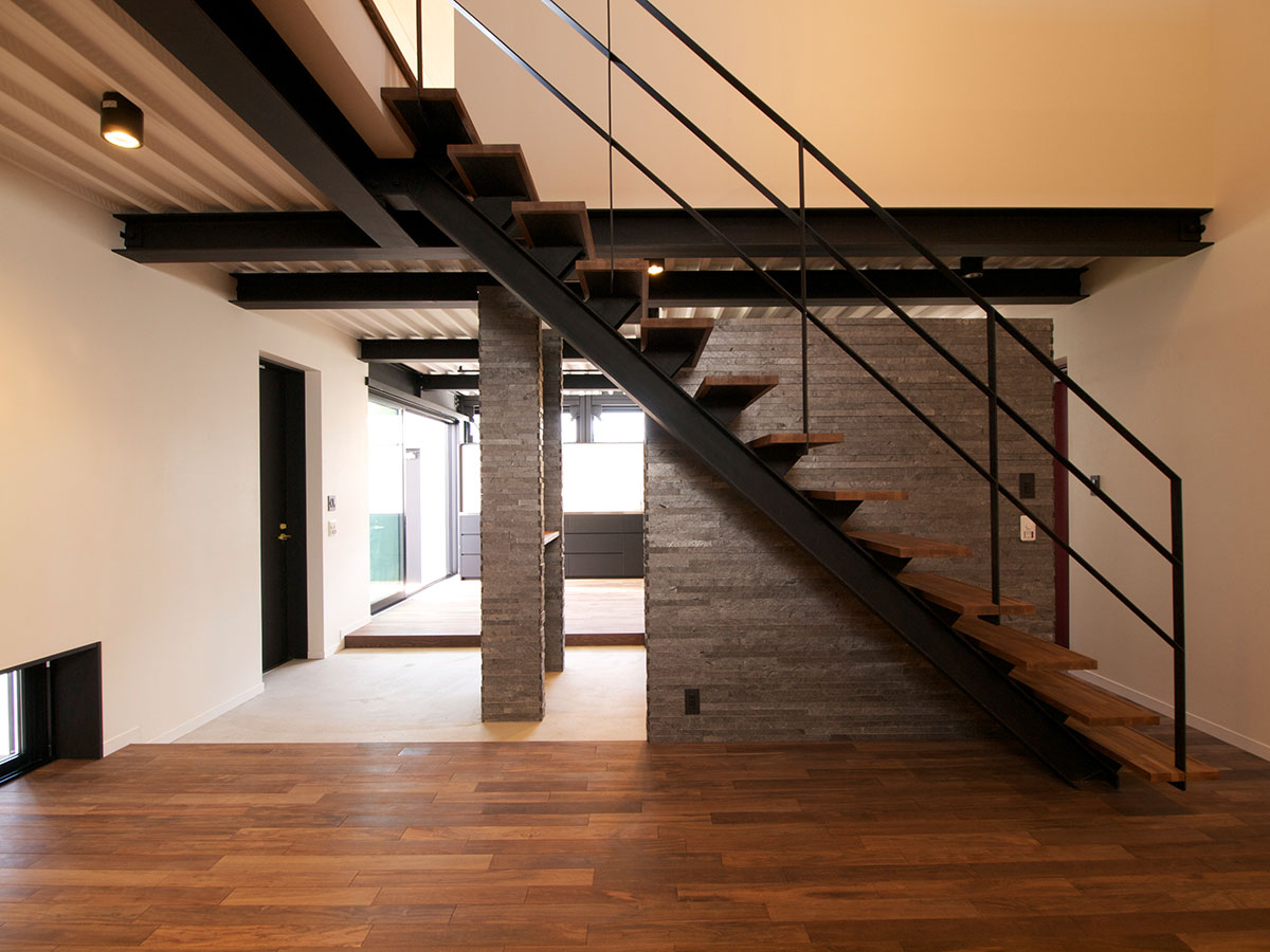 郊外の広い土地に経つ低層の鉄骨住宅。