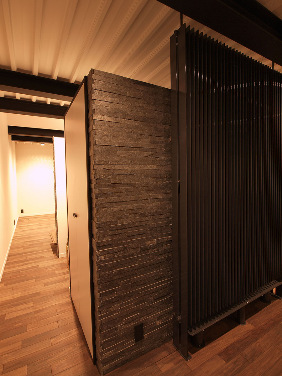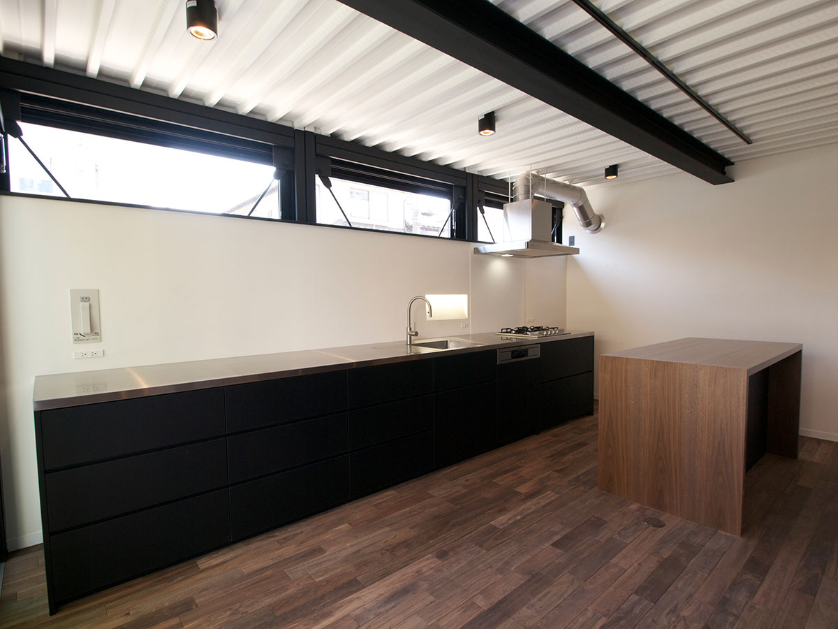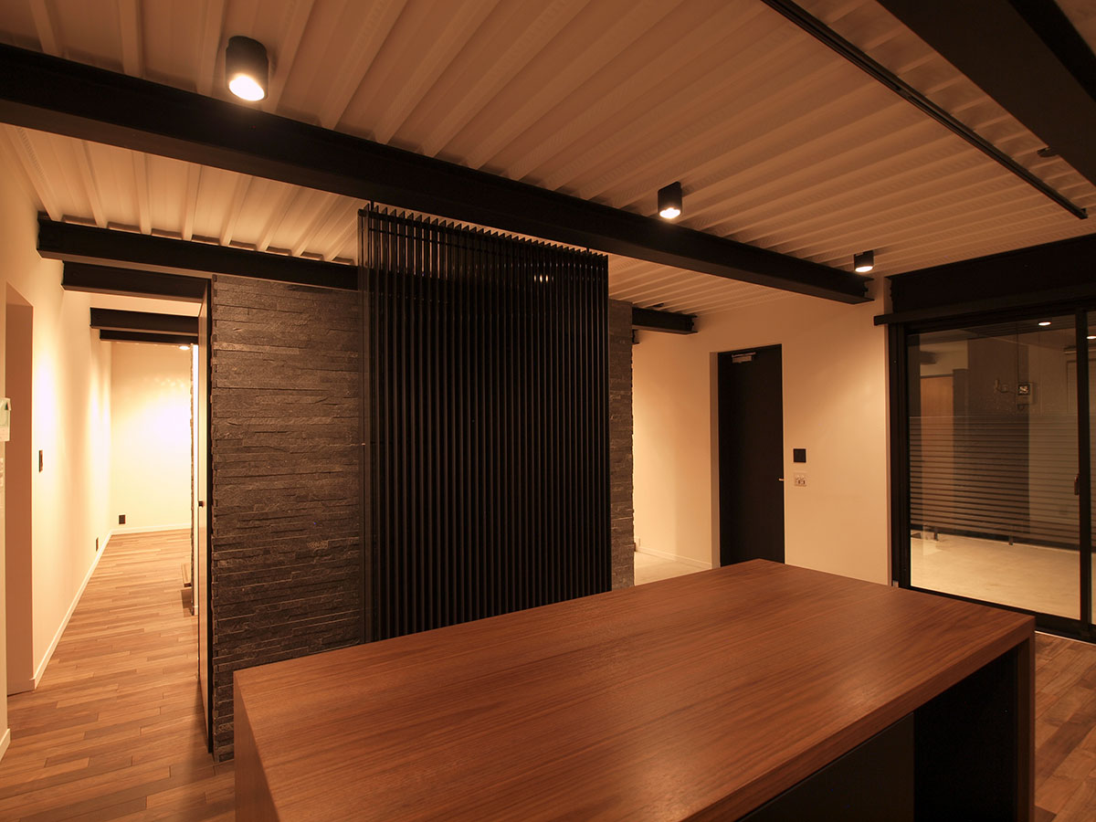 玄関ホールから続く広々としたLDKには、超ロングサイズのステンレスキッチンが鎮座しています。また、石貼りの中央部のユニットは、リビングとダイニングの間仕切りとしてアクセントになっています。