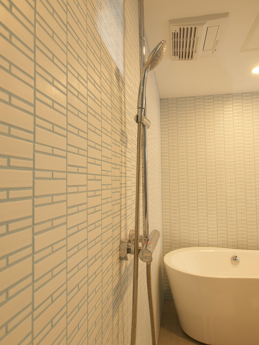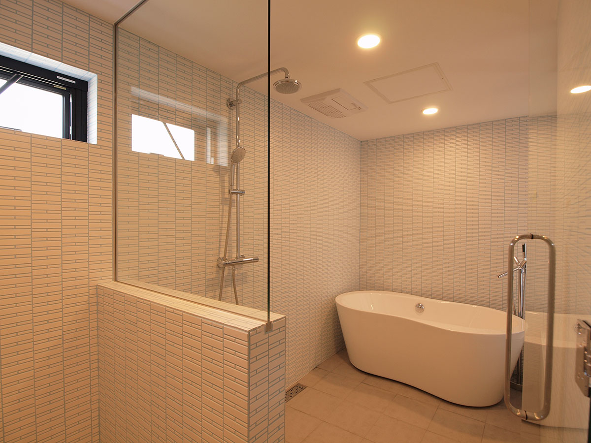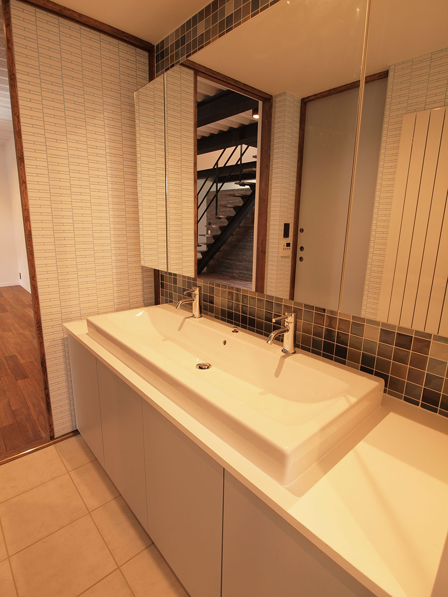 玄関ホールから続く広々としたLDKには、超ロングサイズのステンレスキッチンが鎮座しています。また、石貼りの中央部のユニットは、リビングとダイニングの間仕切りとしてアクセントになっています。