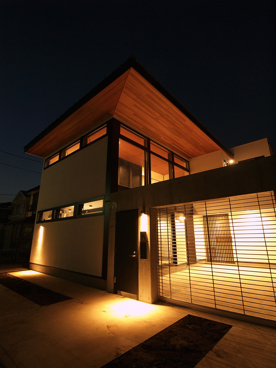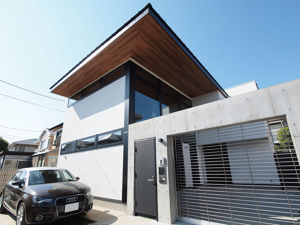 玄関へのアプローチを覆うほどの大きな屋根と中庭に面した大開口が特徴の外観。